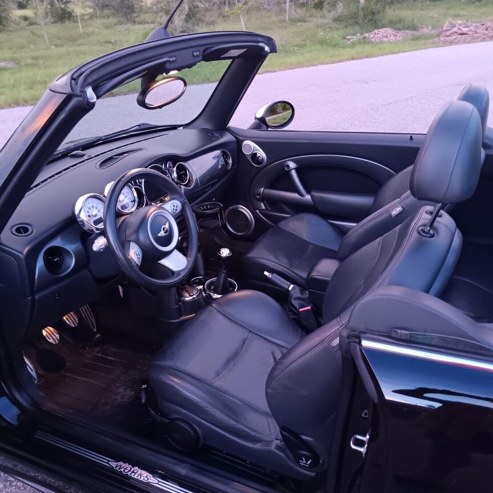 The color scheme of black-on-black is perhaps one of the best combos in a Mini Cooper, especially with a drop-top. Why, you might ask? Well, let’s just agree that the Cooper has a rather cute image, so buying a convertible in a more vivid color might earn you a few secretary’s car comments, unfair or not. Black over black gives the Cooper a slightly more menacing demeanor, which is also helped by the accessory alloy wheels this one is equipped with. The Cooper S always sits low over its upsized wheels, but this JCW looks like it has barely any gap between the top of the tire and the edge of the fender.