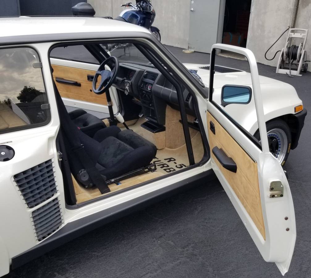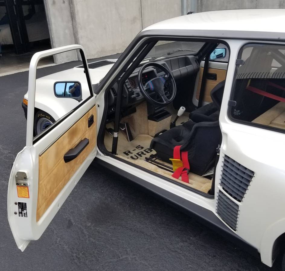 The original version had a very special interior, with unique instrument board, steering wheel and seats. With two exterior colors offered (red and blue), you had a choice between a red/blue interior and a blue/red. Cars like this one, called “Turbo 2” by the factory, had a more-or-less standard European R5 Alpine interior and more trim choices. This one also has aftermarket Gotti wheels, which are more practical than the standard TRX-size rims.