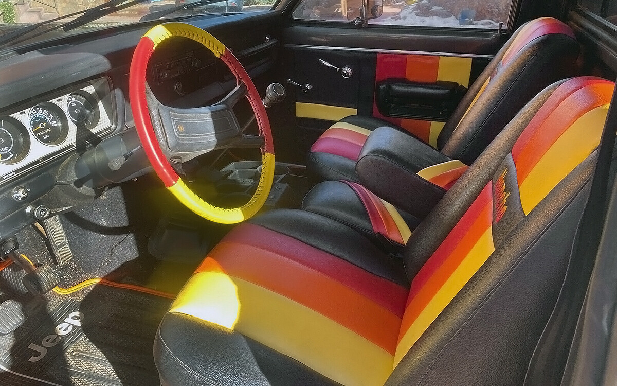 Speaking of a lot of work, yowsa! Those seats! That steering wheel cover! I did not expect to see such a bright interior in a gray Jeep, but it’s interesting, that’s for sure. Those are heated seats, by the way. Just to turn it up to #11, check out the headliner! I know. As a dog lover, I approve, but I maybe would have chosen to use that pattern for a blanket rather than a headliner. I like the restorer’s gumption, though. There’s a manual transmission here, just as most of us were hoping to see.