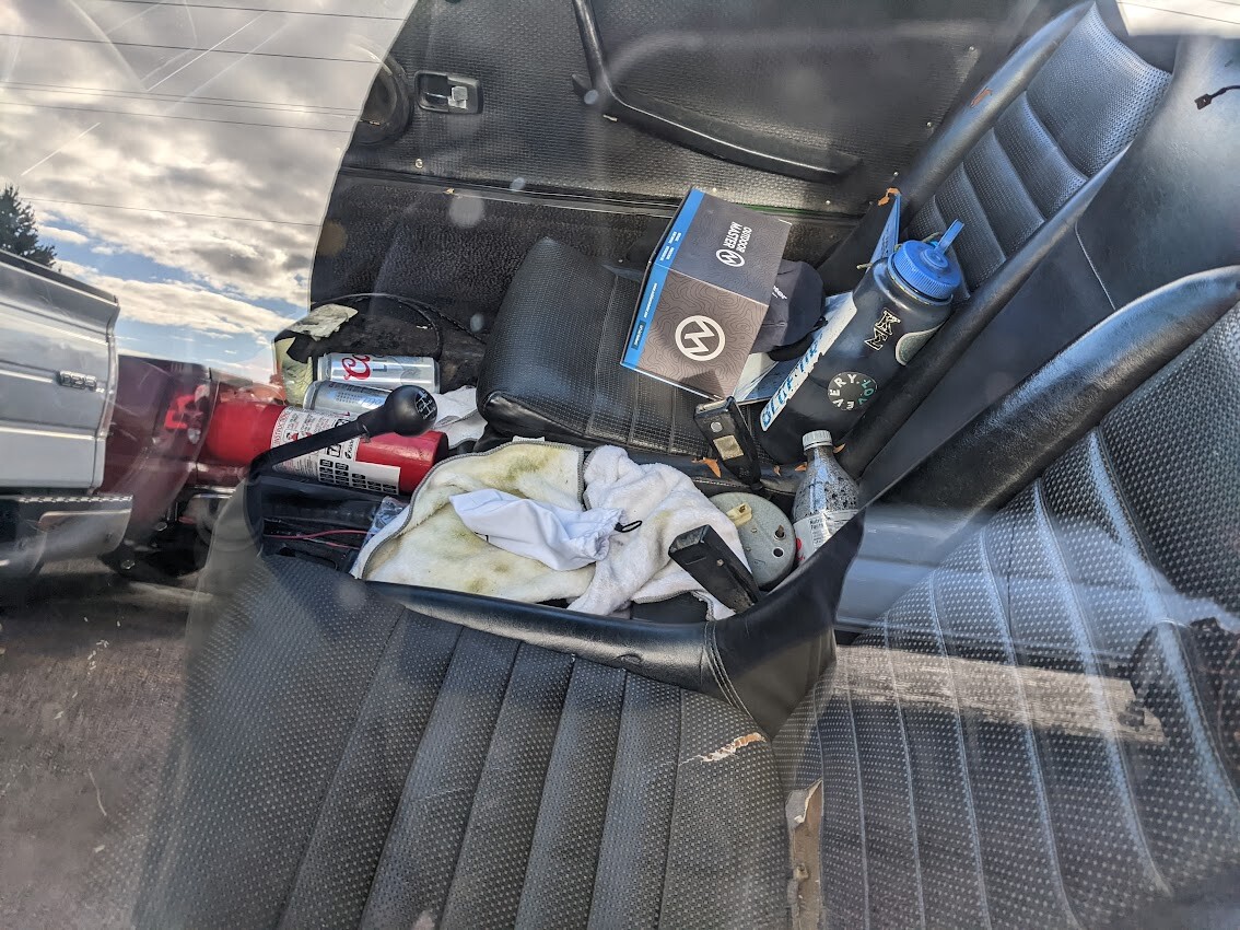 I tried to get a better look inside the engine bay to see how the transmission was mounted up. I’m guessing that’s the original tranny with a custom adapter plate sandwiched in between. The front of the engine does sit pretty close to the rear bulkhead so I’m sure belt changes are interesting. I couldn’t tell if any metal had to be cut in order to squeeze the engine in there. But even if it did, this was probably a good use for a car that might not have gotten restored otherwise.