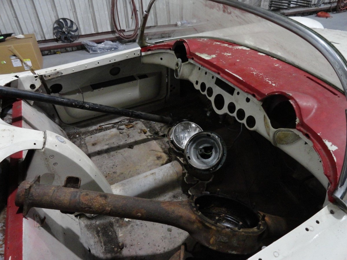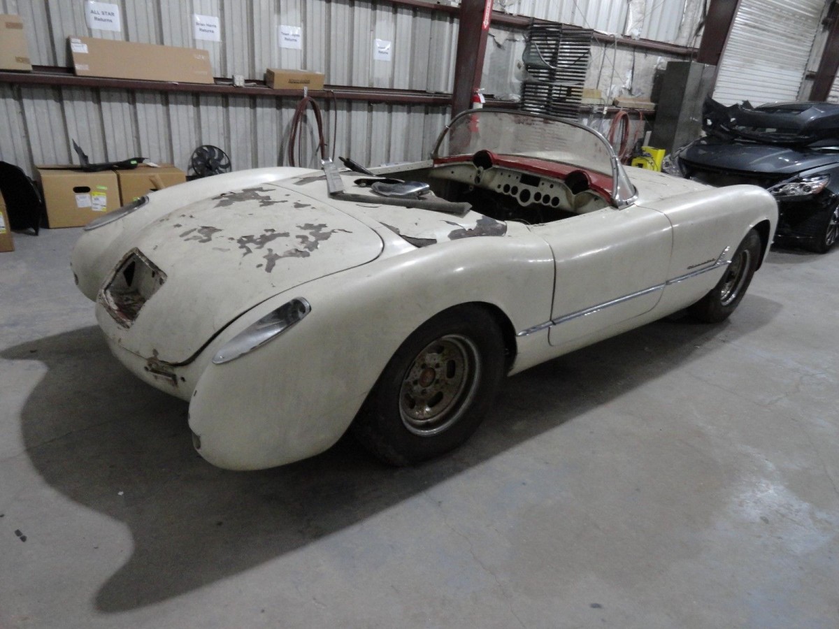 Be fair warned you are going to have to have deep pockets to replace all the gauges trim and specific pieces that have been sold off already. I would also venture to say when the paint is stripped you will find the secret of why the newer rear was installed. My guess it was slammed in the rear and the crafty body man couldn’t find an original 54 rear clip. No other reason to saw a perfectly good car in half. I would hate to imagine finding a rear clip although I do know where a correct 6 cyl. Corvette motor is. Forget it. Motor alone wouldn’t make it anymore desirable in my opinion with everything else left to task.