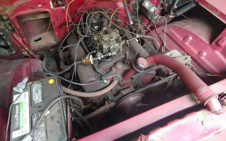 The interior has a lot going on and the seller adds, “I have the front bench seat, it’s worn out. I don’t have the rear bench seat bottom – but the rear top is still in the car – folded down“. The newish-looking carpet is covering the highway department’s missing signage, the door cards are missing and so are some of the dash components. It’s a fairly rough environment and will take some effort, and expense, to return to functionality.
