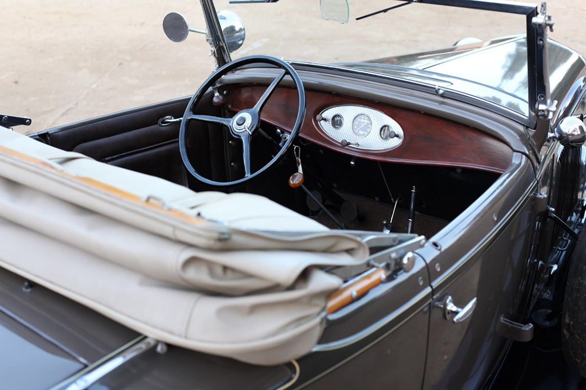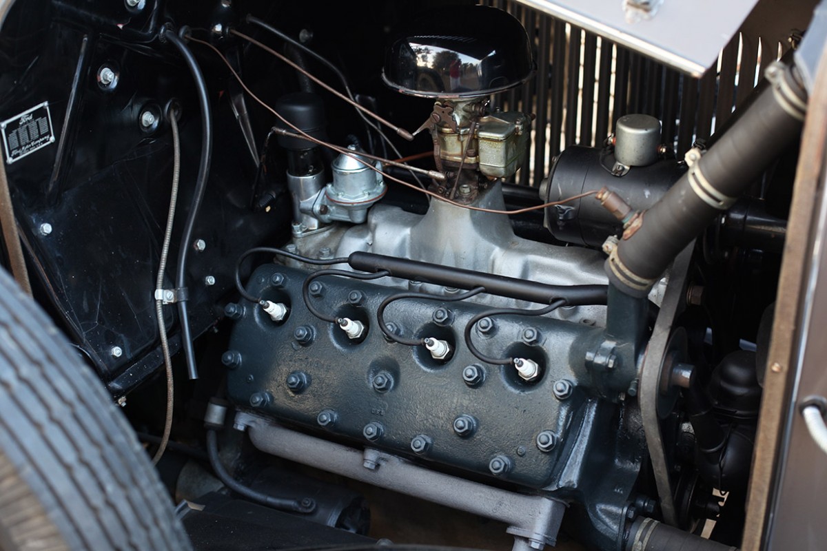 The ’32 Model 18 was essentially a factory-built hot rod. It was light and equipped with Ford’s then-new flathead V8. The 221 cui V8 was rated at 65 horsepower, which was a nice boost over the Model A’s 4-cylinder. The previous owner and restorer was a well know Lincoln and Cadillac parts supplier and went to great ends to get all the correct factory original parts for the car. That is except for the engine, which was replaced with a slightly newer and more powerful flathead V8. There’s no word on what year this engine is out of, but it probably has between 75 and 85 horsepower.