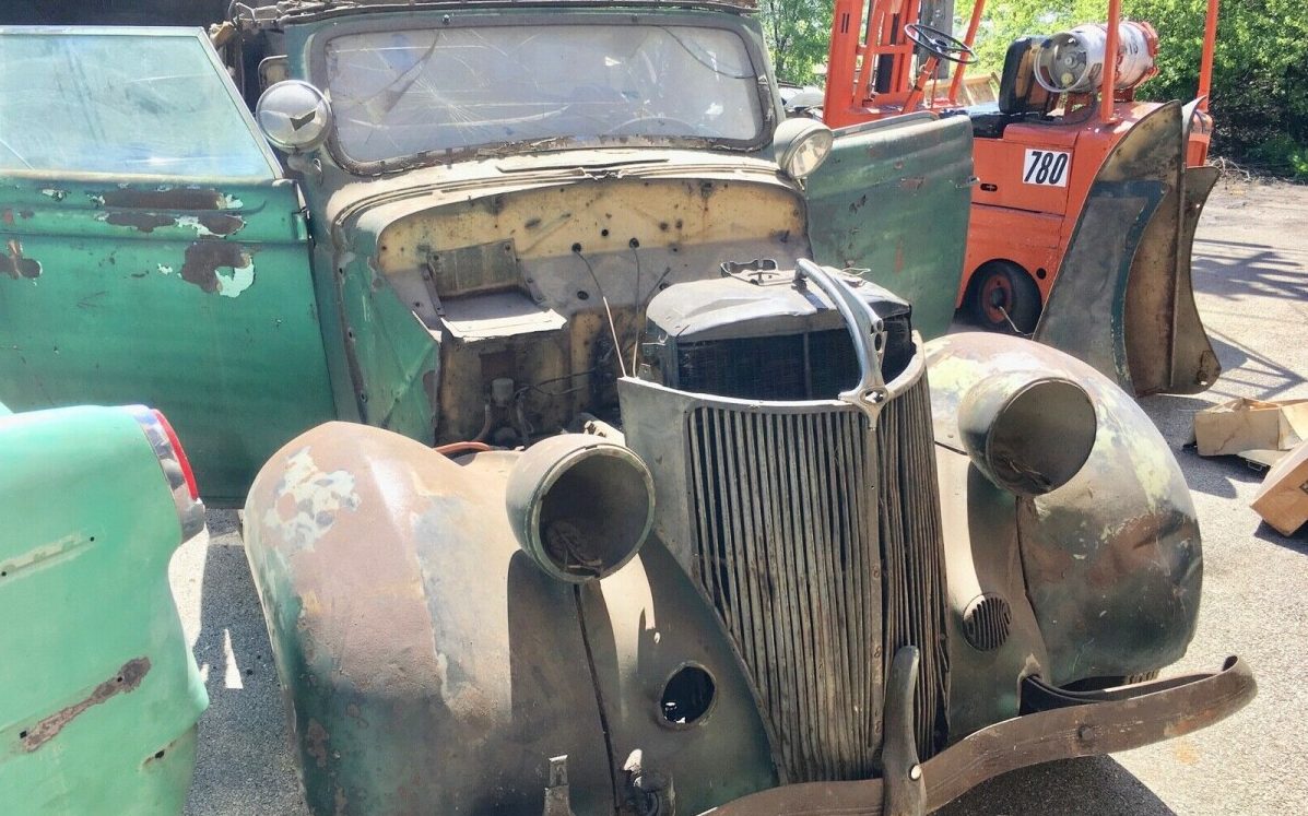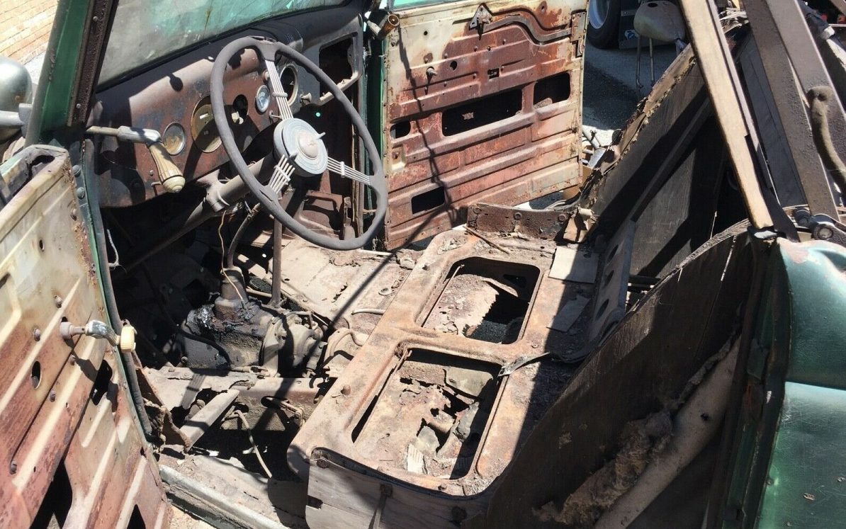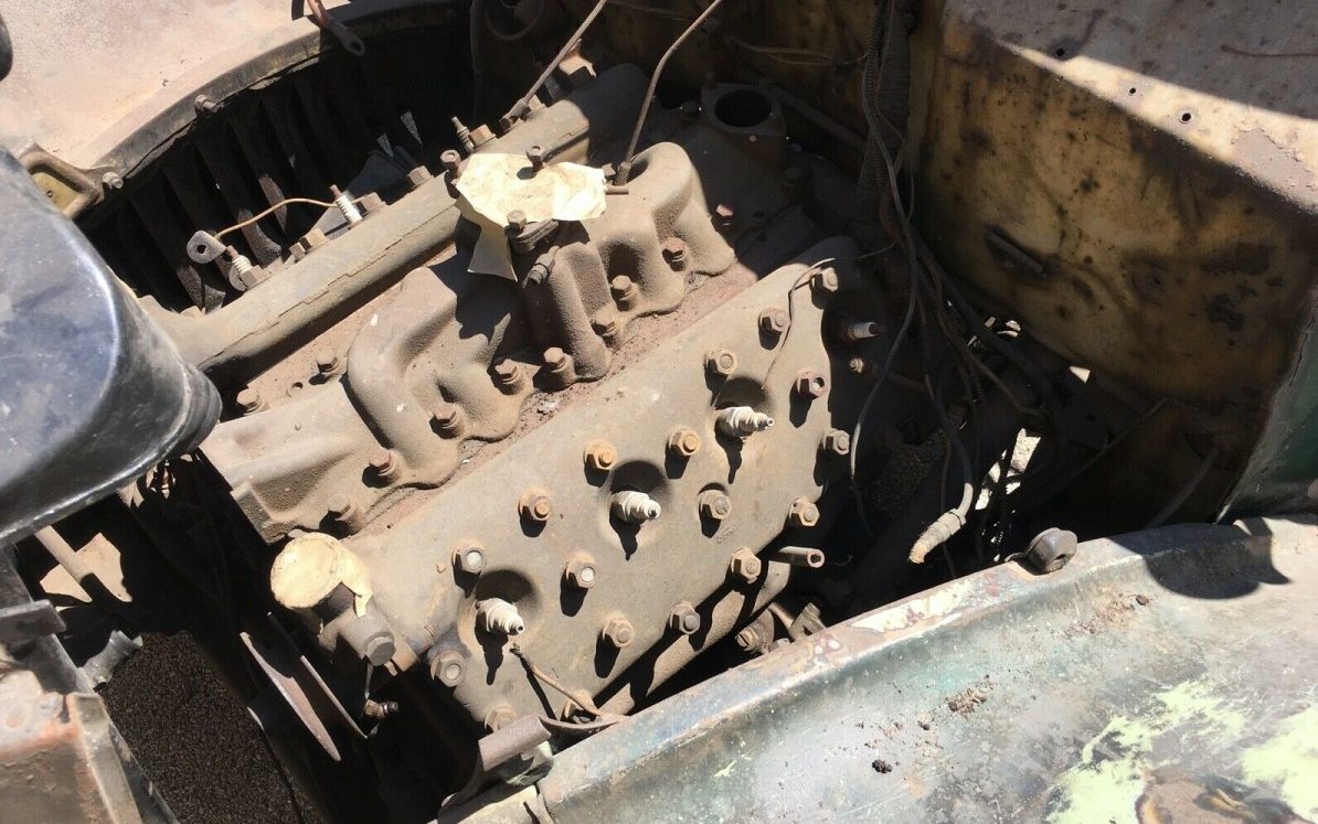 This cabriolet comes equipped with a 221 CI V8 flathead engine, rated at 85 HP, and the requisite three-speed manual transmission. The seller does not know the condition of the engine through it’s evident that there is a lot missing. One image does show what appears to be a manifold and a water pump lying on the ground. He further states that the car had some modifications performed (built?) in 1955 but was parked in the 1960s. Beyond that, there is little detail regarding its provenance or how it ended up like it is today.