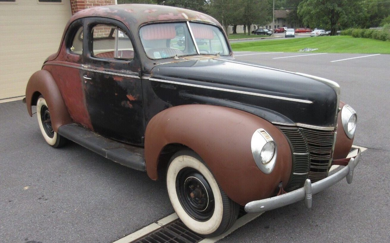 Here on eBay is a car that should start the hot rodder’s heart thumping – a 1940 Ford DeLuxe coupe, sans motor, bid to $10,400 with no reserve. You’ll need a trailer to retrieve it from Lebanon, Pennsylvania. The 1940 Ford DeLuxe is considered the era’s apex of automotive style. Launched in 1937, Eugene T. Gregorie’s redesign of the Ford product became an icon. Modernized with headlights incorporated into its fenders, a forward tilt to the hood and grille axis, and a radical slope from the roofline down to the tail, this is a car that mimics the way a cartoonist draws a fast-moving car. The new Ford wasn’t just a pretty face: it included a more spacious cabin too. The DeLuxe was slotted just below the Lincoln and Mercury but above the Standard. Indeed, it was a substantially different car than the Standard, with a variety of features from the grille and headlamp lenses, to the interior trim and engine meant to set it apart.