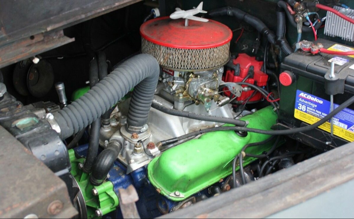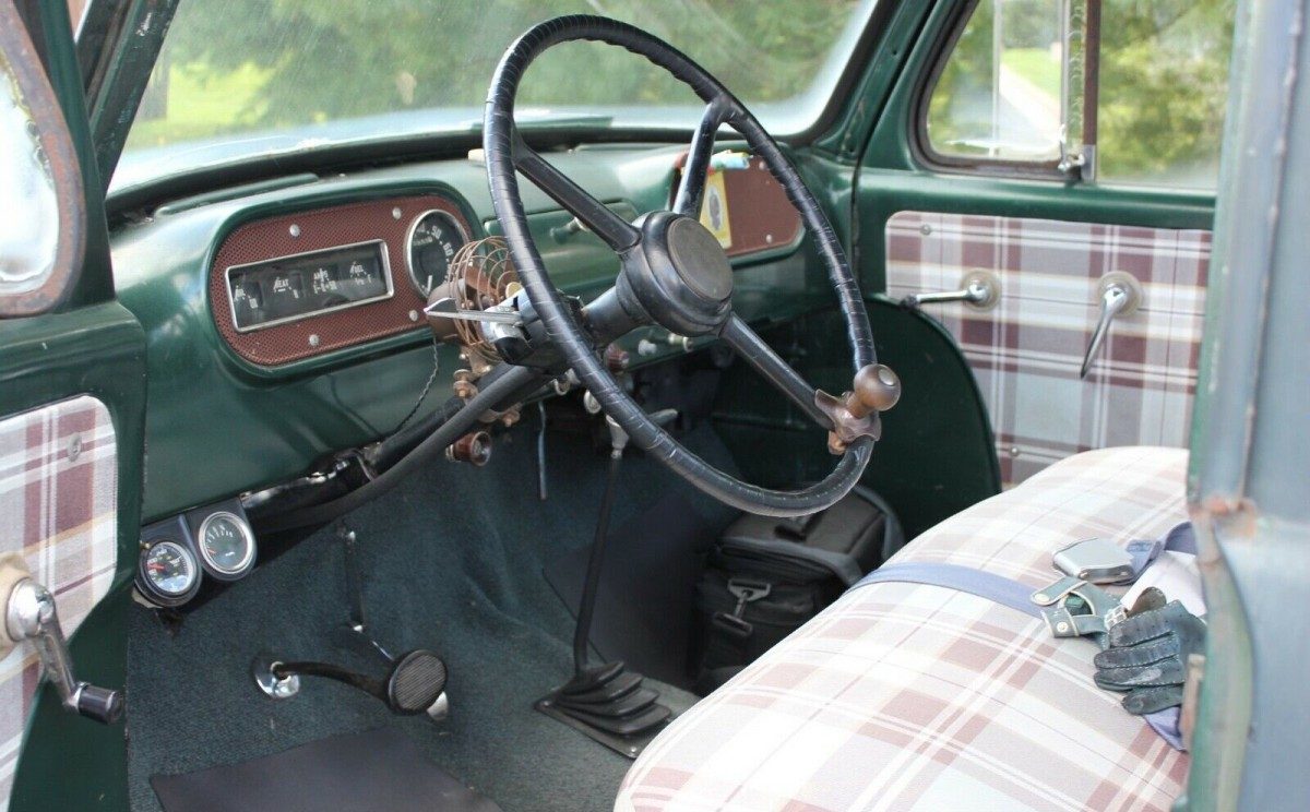 Interior options for 1954 included a new ‘Air-O-Ride’ seat, with an air pressure regulator located underneath to adjust the cushion level. The interior of our feature vehicle appears to be well-maintained and mostly original, with a couple of aftermarket gauges located under the dash. The plaid fabric adorning the door panels and the bench seat adds to the old farm truck charm, and it looks like there are no rips or stains. The seller notes that the driver’s side window is cracked, as is the main rear window.