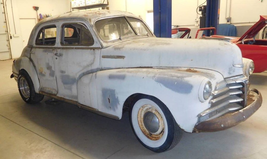 A 1948 Chevy Fleetline with a 292 cu in inline 6-cylinder engine, 4 wheel disc brakes, Mustang II front suspension.