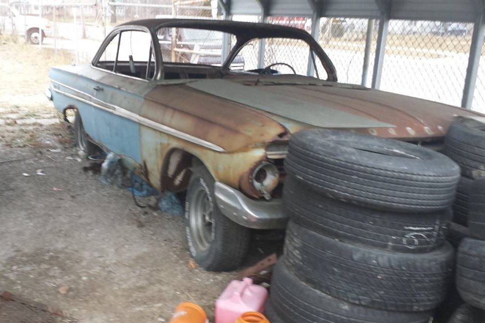 A 1961 Bubble Top Impala–not sure about the glass. Included in the sale is another 1961 2-door car maybe for parting to make the two cars into one finished project?