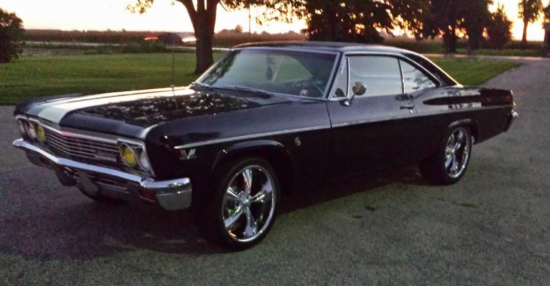 1966 Chevy Impala Fastback, 454 bored out to 461 mated to a Turbo 400 trans, four-wheel disc brakes, and fog lights. Nice wheels and skins. No patina and it looks. . .nice.