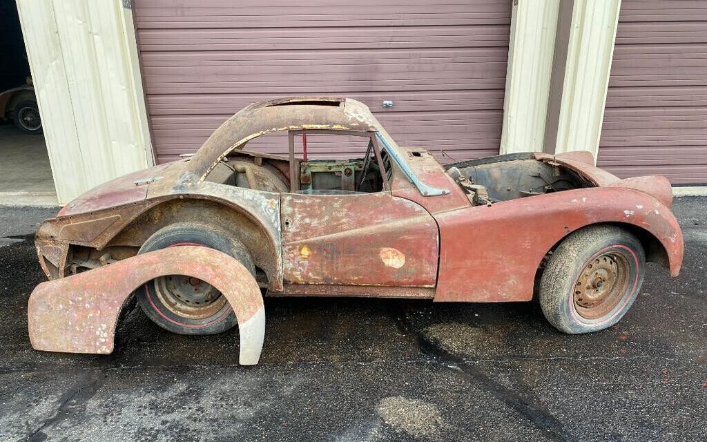 The green 1954 Doretti shows off Healey-esque lines, but don’t dismiss it as similar: the Doretti solved some problems that plagued other British cars. Its track was as wide as a 100-4 and wider than a TR2, and it was over five inches longer than either one. The car’s suspension geometry prevented the “hop” that the TR2 could dish out. This example has a clean title and though the engine is not installed, it is with the car. Speaking of motors, the 90 hp 1991 cc Triumph motor could usher the Doretti to 100 mph, but thanks to its heavier curb weight, overall it was slower than a TR2.