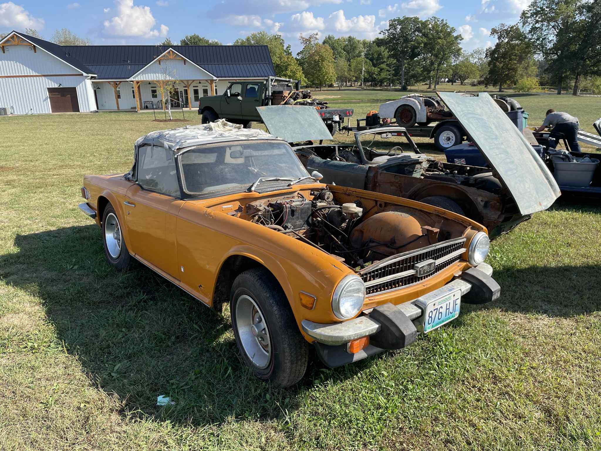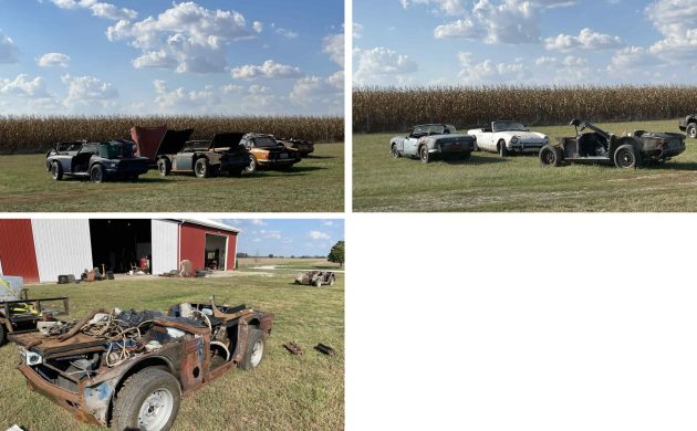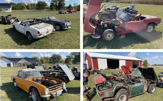 The story behind these cars is sad; to make it short, the gentleman who collected them (and many more Triumphs and parts) has become disabled and has moved on to a nursing home. His son was selling the collection (except for one car he is keeping) and unfortunately has run out of time — all the cars and parts were stored in the red barn behind the cars in some of the pictures, and the lease is up on the space. Now, and for the next couple of days at the most, is the only time the cars can be picked up. A friend of the collection’s owner named Chris is trying to facilitate getting the cars a home (details are in the Facebook post, as is his contact information), and they are essentially free for pickup at this point (any donations appreciated, of course). My understanding is that all the cars have titles as well! I purchased one vehicle for the collection and drove out from North Carolina to pick it up last week — I can vouch that these cars can be restored. In the pictures above, you can see a Topaz late TR6, several other TR6s, a red Spitfire Mk. 1, a white Spitfire Mk. 3, and a blue Spitfire Mk. 2 that has been nicely converted to a Spit-6 with GT6 parts!