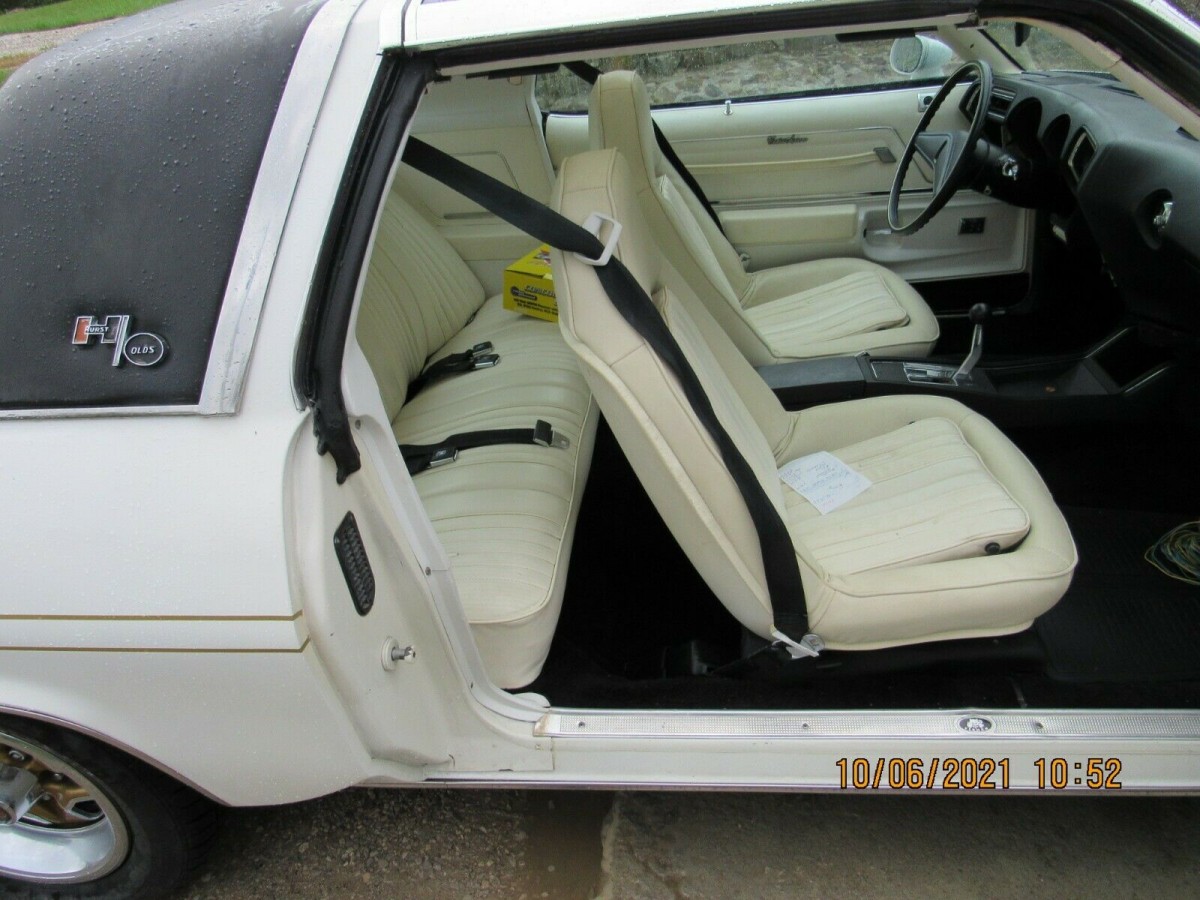 Oldsmobile holds the distinction of being the first company to introduce T-Tops on a car in the United States.There were 2,535 Hurst/Olds edition cars built in 1975. Of those, 1,293 were white and 1,242 were black. Slightly more W-25’s were built in 1975 (1,342) than the more powerful 455 equipped W-30 cars (1,193). This car is said to be rust free and lived in a garage in California for most of its life. The odometer reading shows 35,300 miles which the owner believes is the second time around the block.