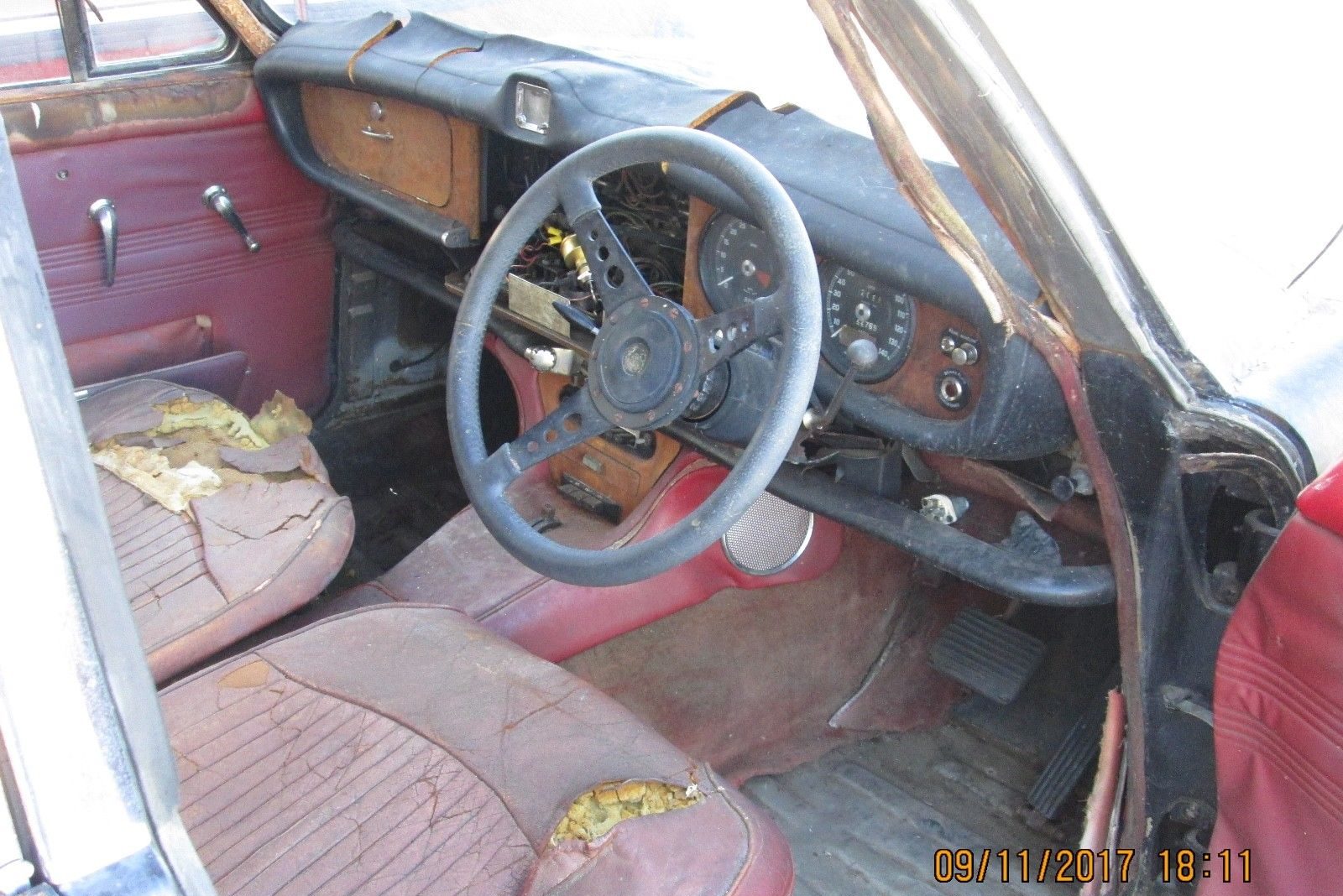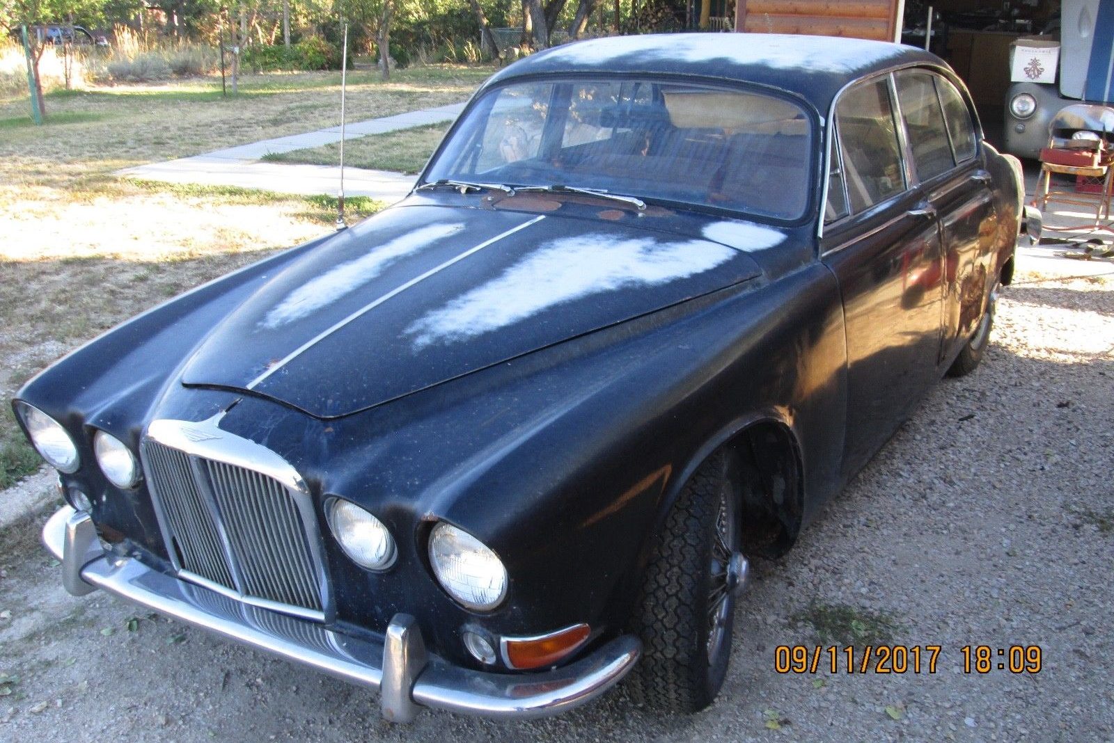 The Jag’s pretty worthless, ‘cept for a few parts but what’s that odd looking sports car behind it in the garage? Has sorta a Cobralike look to it . . . maybe an old Jensen or something??