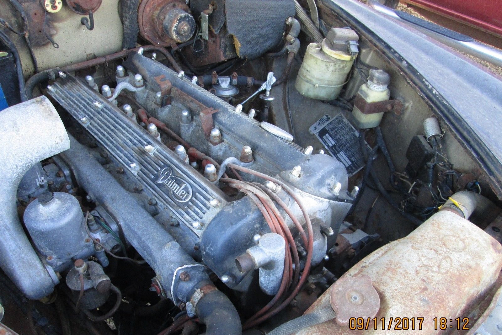 The “Daimler” callout suggests an engine from a Daimler Sovereign, a badge-engineered sister car to the Jaguar 420, however a Google Image Search confirms that some minority of 1967 Jaguar 420s sport the finned Daimler valve covers. Jaguar parts adorn the grille, wheels, and rear badging which differ on the Sovereign. This twin-carb version of the 4.2 L inline six cylinder engine produces 245 HP and 280 lb-ft of torque, slightly more and less (respectively) than a late ’80s 5.0 Mustang in a car that weighs about 3800 lb, about 400 lb more than the “5.0.” Some details from automobile-catalog.com. The Jaguar engine bay would have been painted body color, suggesting a buttercream hue may have originally graced this 420, a classy compliment to the deep red leather. Based on condition and today’s market, who sees more than a parts car?