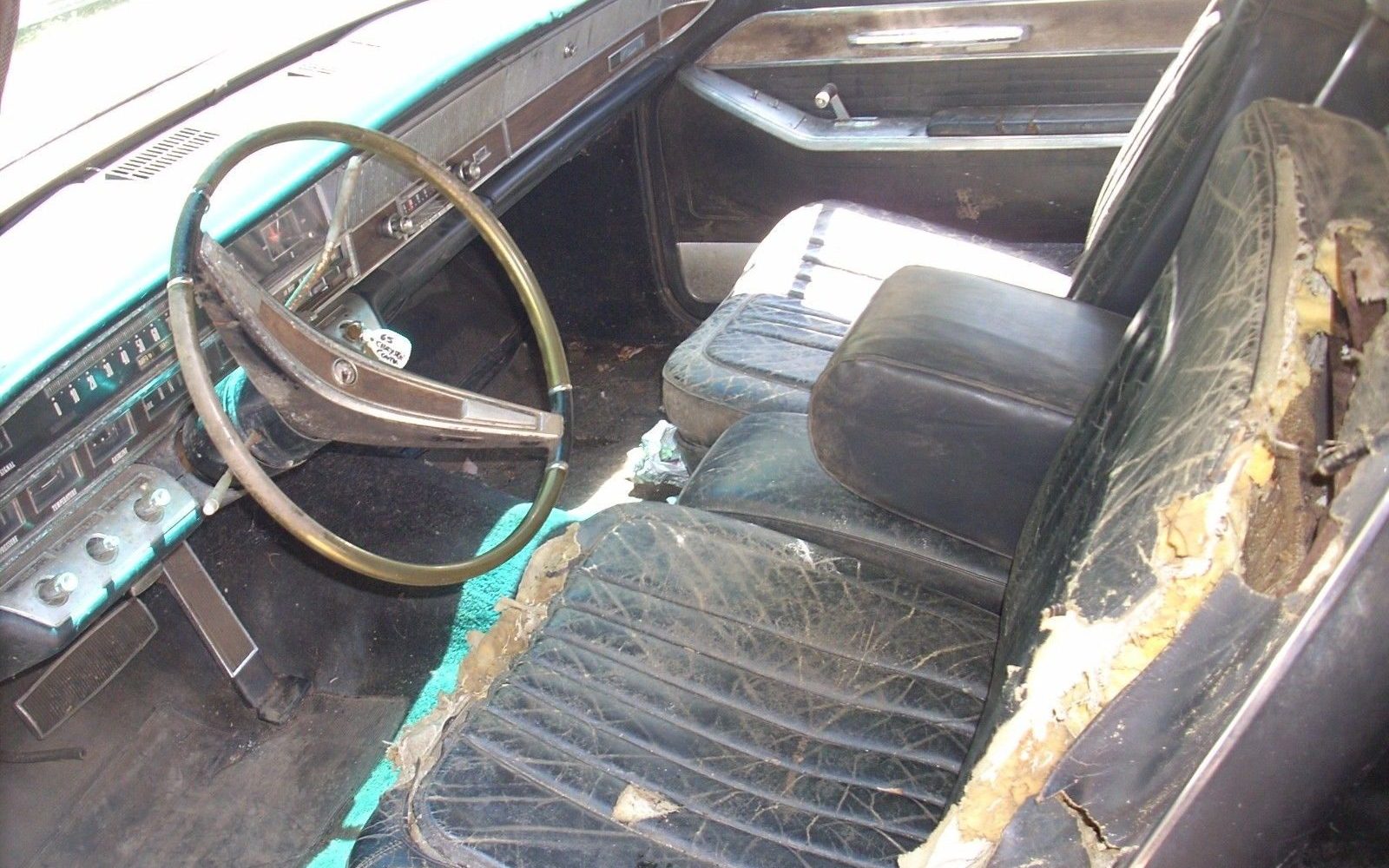 Though this car looks to be all-around complete and restorable, the interior is a veritable nightmare. Although both I and you have seen worse, the interior of this Chrysler needs just about everything. The rear is nearly as bad as the front and subsequently all of the seats will need to be recovered. The dash looks like it may have some sun damage, although all of the gauges, handles, and other shiny things look to be present. The damage pattern in this Imperial is consistent with being a convertible, i.e. it has sustained a lot of sun damage. There is plenty of interior left to work with though!