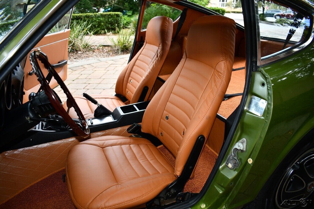 Now, when you see the interior, it really does start to seem like this 240Z has been restored. It’s just a little too perfect inside, with upholstery that shows virtually no wear and tear and carpets to match. The paint is also very shiny inside the door jam which suggests to me it’s been resprayed at least once. Still, it seems odd not to mention those details in a listing like this, but whatever the story is, this is an outstanding exterior/interior color combo.