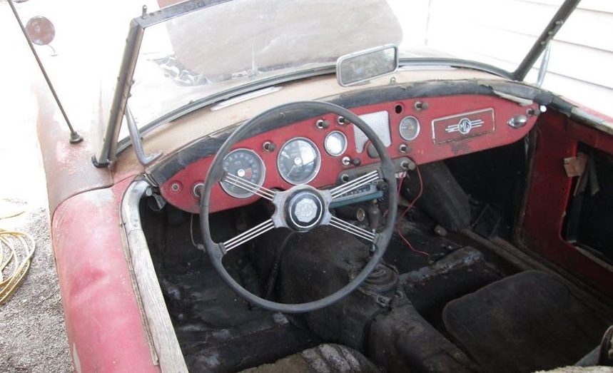 The interior looks reasonably complete, especially for a car that’s supposedly been sitting for decades. Whether it’s had a soft top in that time is unknown, but the floors appear to be present and the seat upholstery isn’t too rough. The dash panel looks largely original and matches the exterior color, and all gauges appear to be intact. The MGAs were spartan affairs in the purest roadster tradition, so don’t expect too much in the way of luxuries once insider – but as well all know, the upside is there’s less stuff to break or repair.