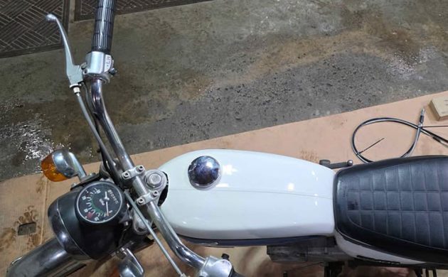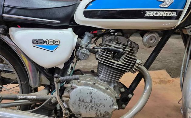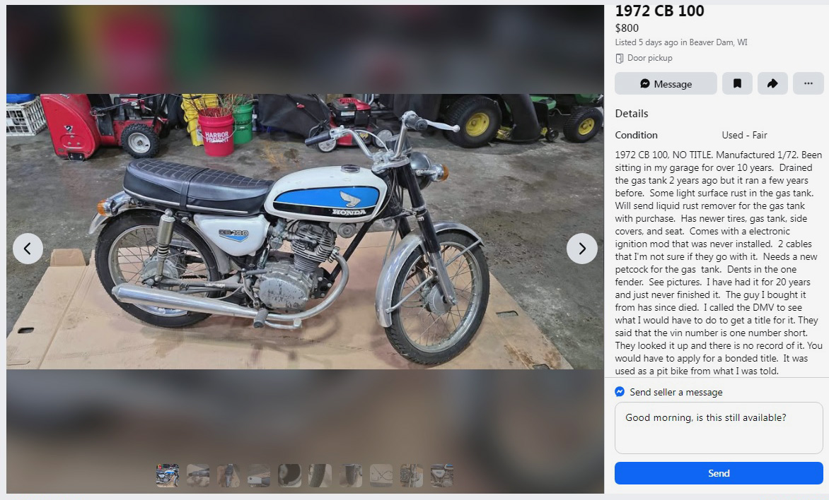 As with most craigslist and Facebook Marketplace ads, the photos can sometimes be iffy as far as giving a good overall representation of a vehicle for sale. Sellers sometimes don’t seem to think that it’s important to get overall photos of all sides of a vehicle, which seems strange to me. In the case of this CB-100, we don’t really get to see the left side for some reason. I hope it’s ok on that side. Otherwise, it seems like a nice bike overall from what is visible. There is a big dent in the front fender, though, which they show.