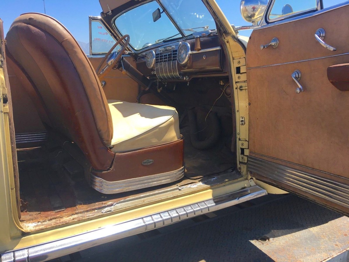 Here’s the Caddy droptop in all its dusty glory. It was last registered in 1984. The front will look a little strange or perhaps a lot strange to those well versed in things Cadillac. The grill and bumper are from a 1947 Cadillac. It runs and stops well and there is said to be very little rust. Most of the chrome looks OK except for the bumpers. The condition of the leather upholstery under the seat covers is unknown but the door panels and much of the interior appear to be in usable condition.