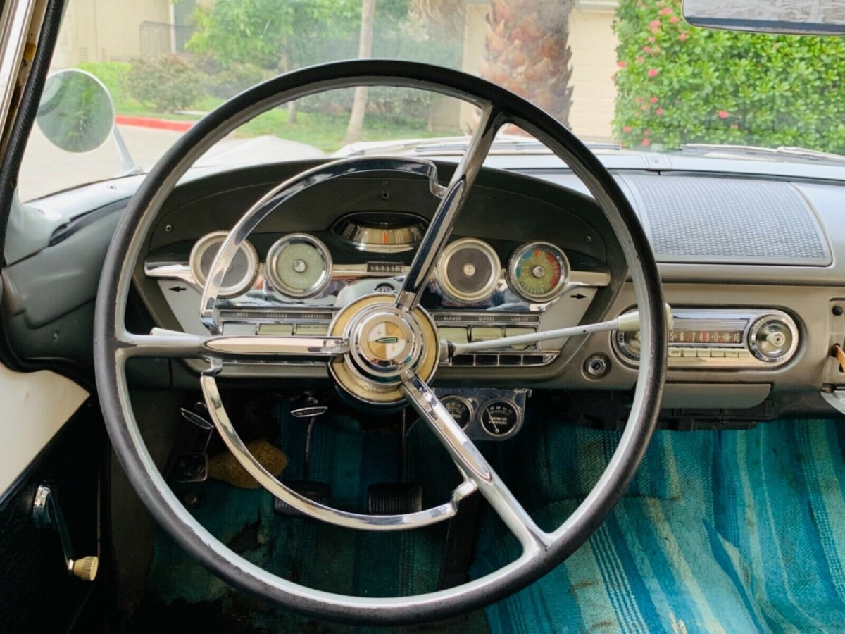 Very strange to be missing the center steering wheel push buttons, although there appears to be a shift quadrant indicator on the steering column – something I’ve never seen on first year Edsels. Probably worth the $3500 just for parts alone… but what a waste that might be. Much better pictures needed to break loose my Yankee dollars for any reason.