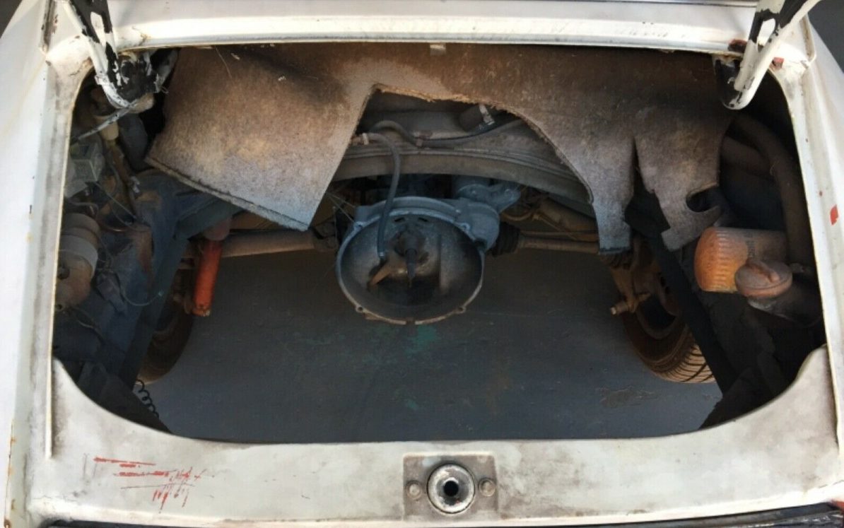 Well, it’s white now but other colors seen adorning this Porsche include, silver, blue and red. The seller states, “Overall the sheet metal on this car is very solid and has had no areas replaced” Maybe overall, but this image is a bit shaky looking and the body surface rust looks pretty invasive. While there is no obvious evidence of crash damage, a potential buyer would want to check this 911 out comprehensively, topside and bottom side – rusted floor pans are mentioned as a problem area, so there could be more. Whether all of the trim is available or not is uncertain, an inquiry would need to be made. Finally, the seller suggests, “Drive as is with patina or restore fully” The basic assumption is that this activity could not occur until the engine has been reinstalled but drive with this “patina”? I have seen passable patina on any number of cars and trucks, and “passable”, this isn’t IMHO.