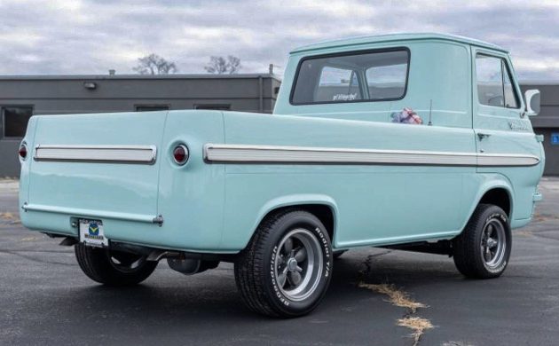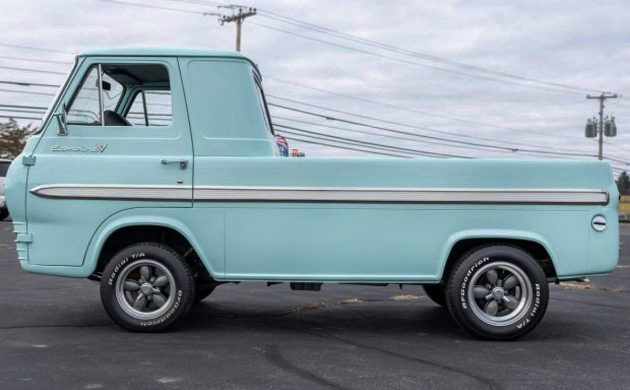 I bet the V8 adds to the overall ease of “stoppies”. No 500lb. ballast on the floor needed like the Corvair ad falsely showed. An incredible build on probably one of histories worst renditions of a pickup truck. These were never designed for a V8, that came out in 1969, and could make a dangerous vehicle even more unpredictable. Stopping it may be a challenge, and like all cabovers, you get a birdseye view of the impending rear ender. That engine cover may get a bit warm too. It really is the sharpest Econoline pickup I’ve ever seen.