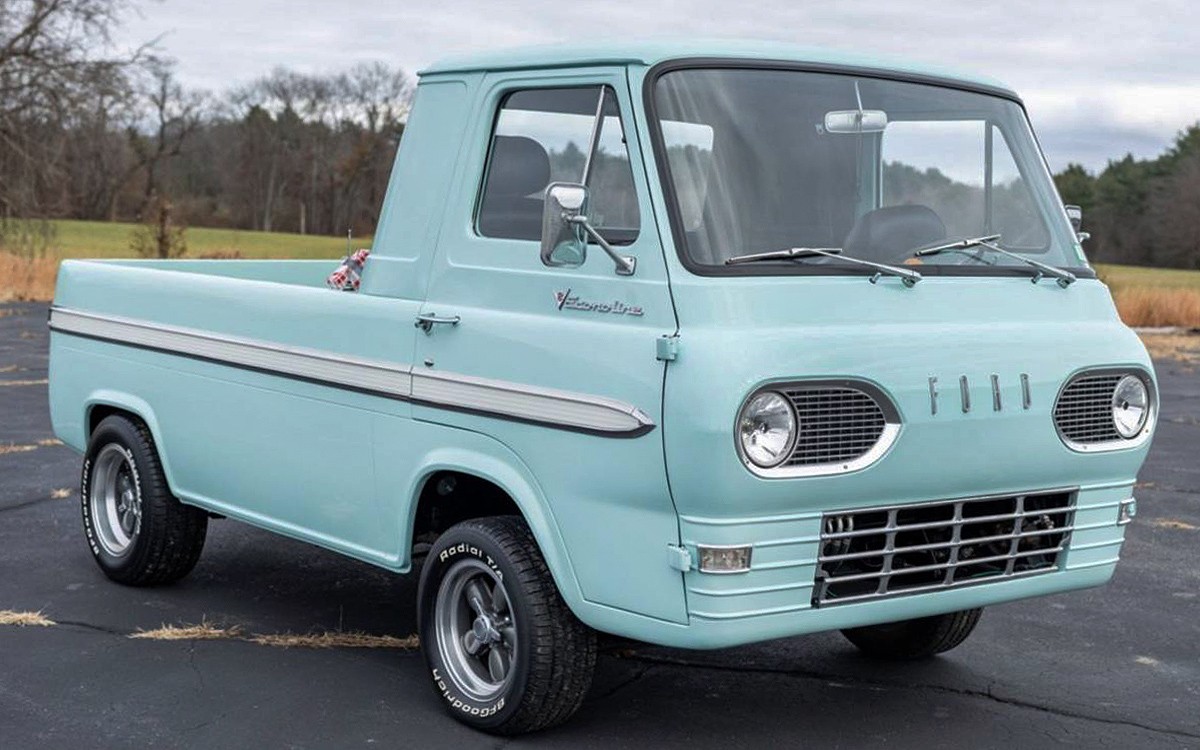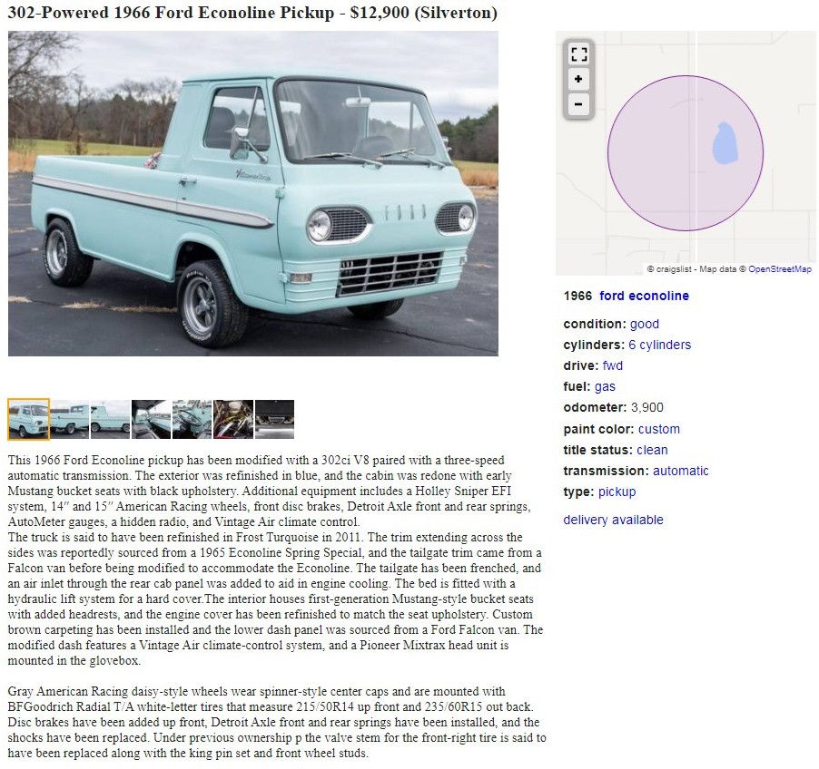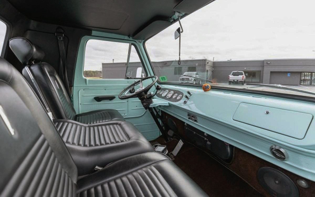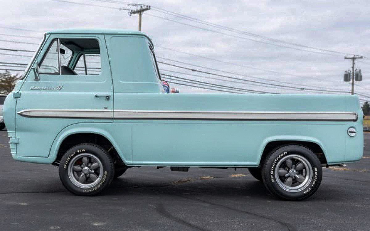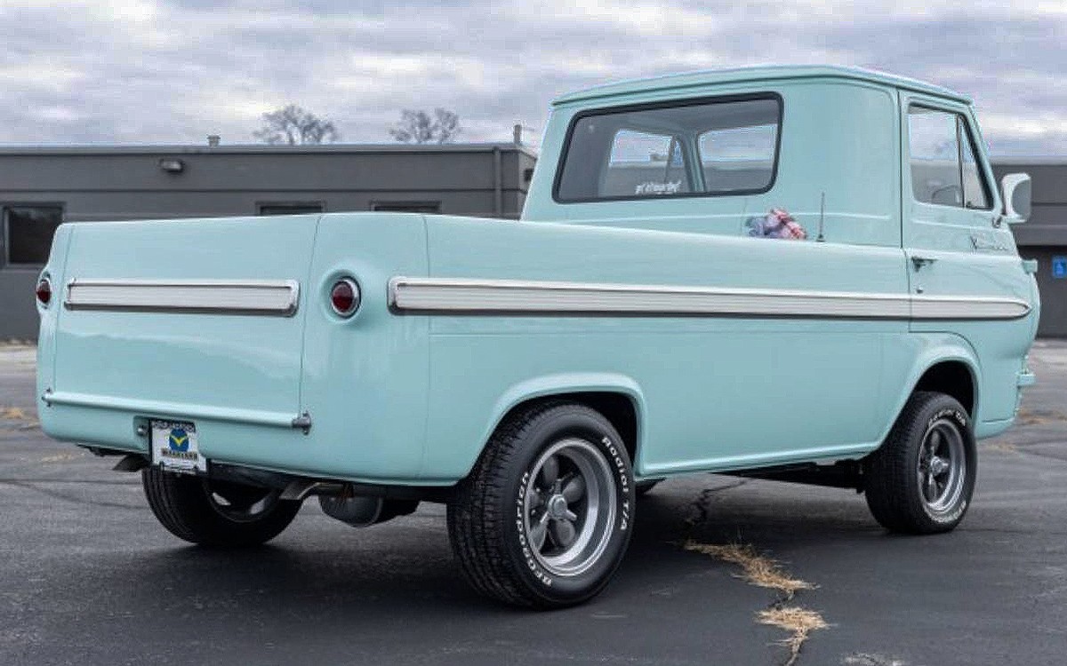 I bet the V8 adds to the overall ease of “stoppies”. No 500lb. ballast on the floor needed like the Corvair ad falsely showed. An incredible build on probably one of histories worst renditions of a pickup truck. These were never designed for a V8, that came out in 1969, and could make a dangerous vehicle even more unpredictable. Stopping it may be a challenge, and like all cabovers, you get a birdseye view of the impending rear ender. That engine cover may get a bit warm too. It really is the sharpest Econoline pickup I’ve ever seen.