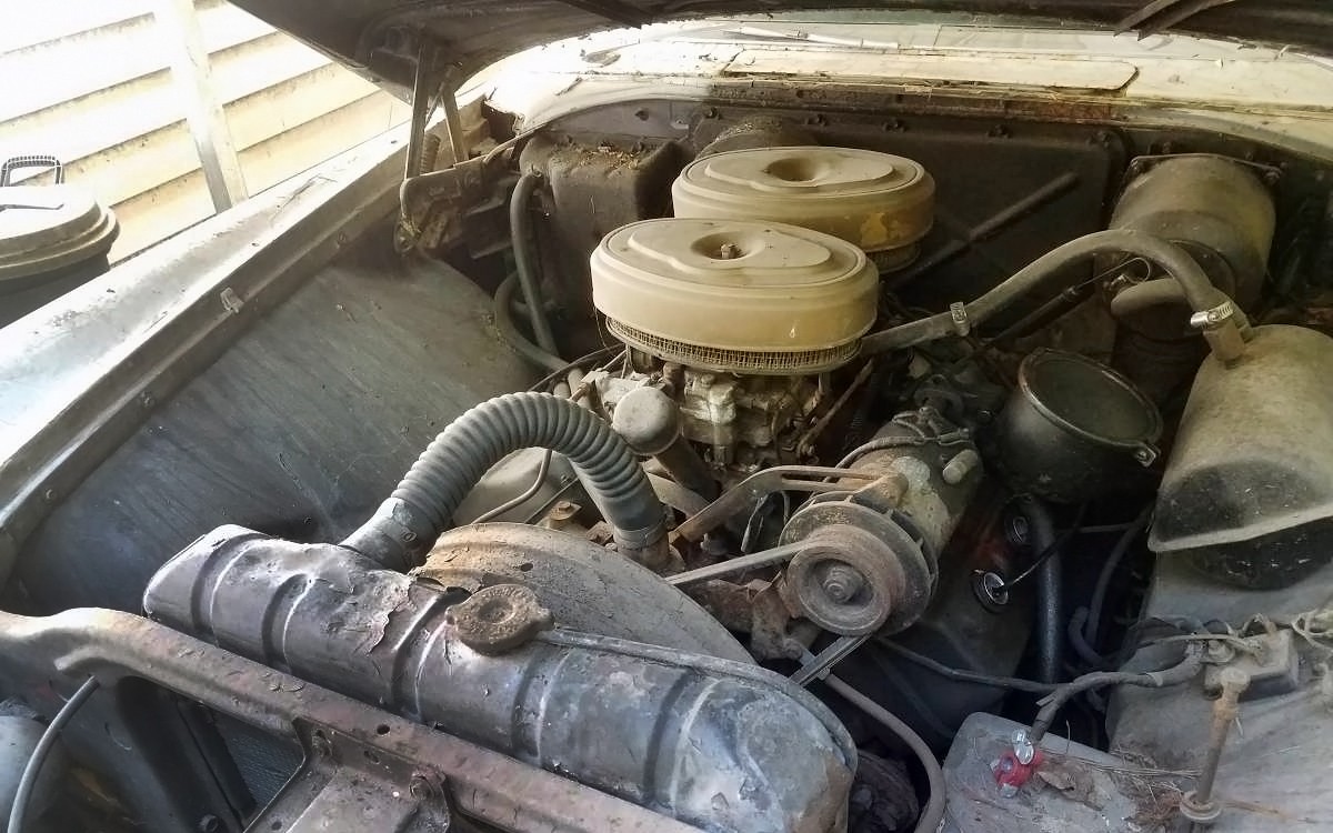 Both of my cars were equipped with these 2 air cleaners, not the big delta type. Both of my cars were also built with the new Torqueflite 3-speed automatic transmission. I noticed the car featured here has the 5 buttons on the shift quadrant to the left of the steering wheel. That means it’s equipped with Torqueflite.