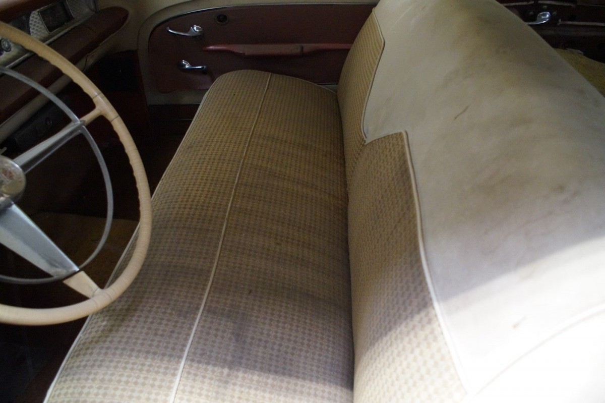 The interior appears to be well preserved. I’m not sure if these are the original seat coverings, but appear similar to some found in the sales brochure. There are no rips in the seats. The dash padding appears to be in good condition. The headliner is also in good condition but is sagging. The front seat is power operated while the windows are manually operated.