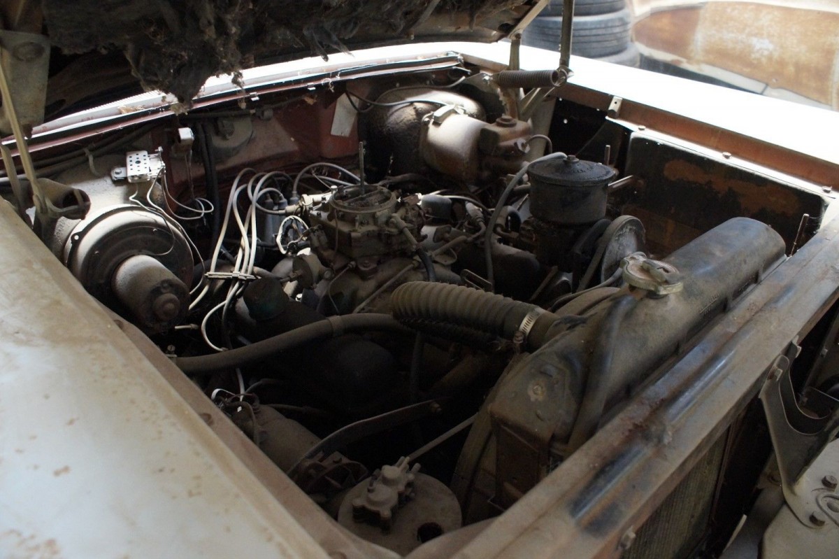 The engine is a 364 cubic inch V-8 that originally produced 300 horsepower. The car does not run, but it does turn over. The mileage on the car is 64,000.