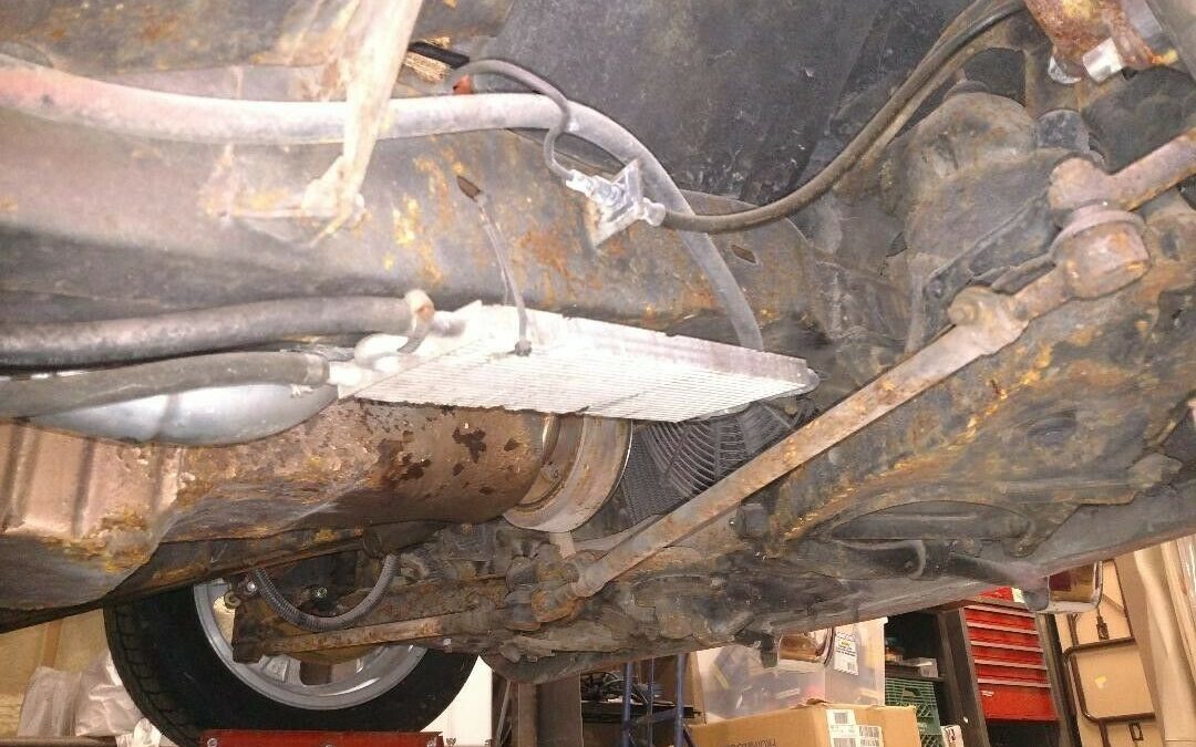 Ridiculous location for an oil or transmission cooler! I expect the installer who chose that position never expected to inadvertently graze a speed bump or negotiate a concrete driveway apron at some speed. Looks silly there. The rubber lines no doubt open to all sorts of road debris and possible malicious behavior by vandals.