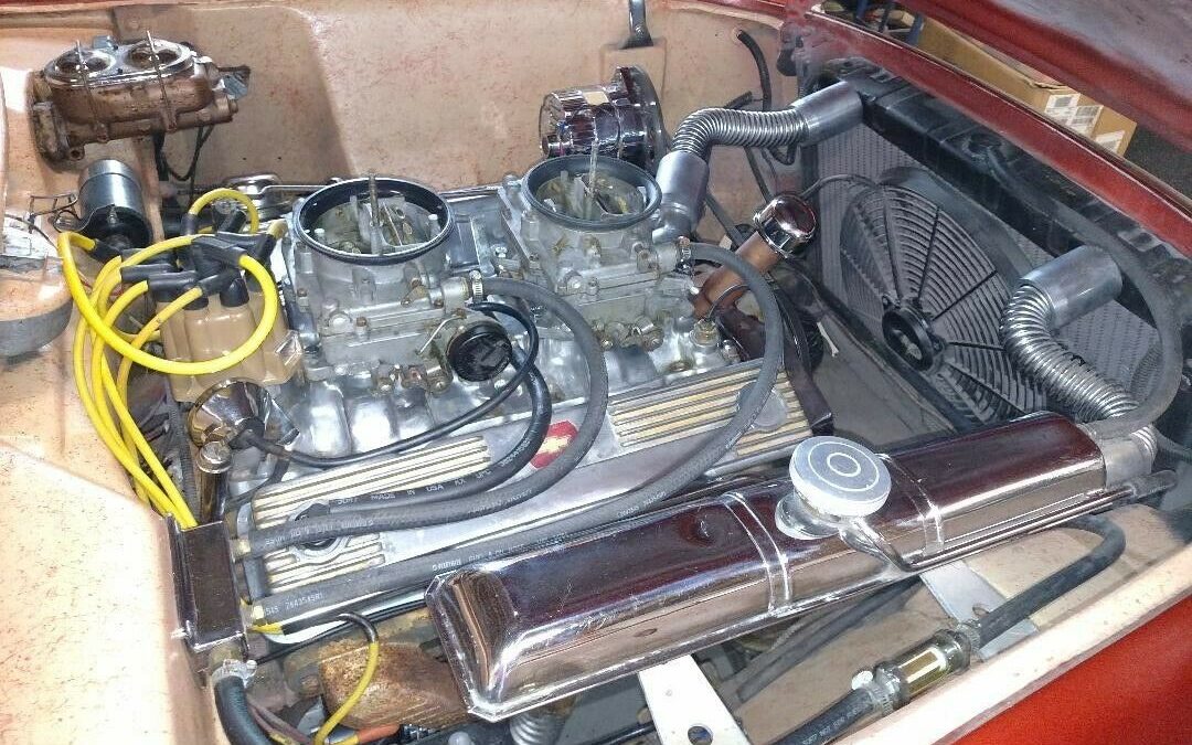 Evan, I thing there was a 310 CID small block in the late 70s. Maybe that’s what’s in there. It look great. I think the dual quads is a little over kill, for a car that light. the rest of the exterior and interior is done nicely. I love the color.