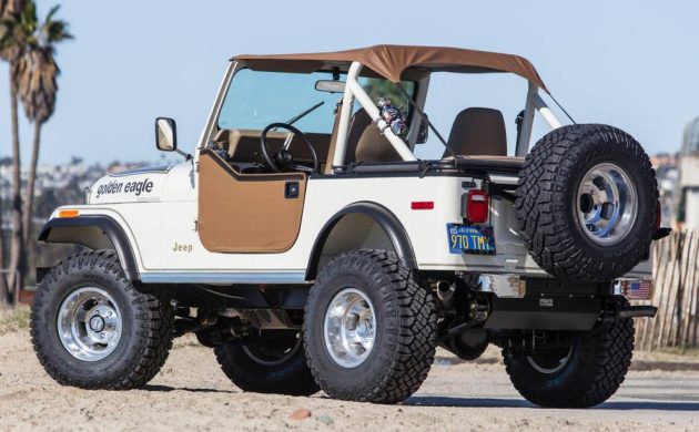 Jeep introduced the CJ-7 for the 1976 model year. It remained available until 1986, and while many consider it an evolution of the existing CJ-5, the latest offering was physically larger, featuring changes below the surface to improve overall strength and stability. This 1979 CJ-7 is the Golden Eagle variant, which the seller confirms recently emerged following a nut-and-bolt refurbishment. The vehicle presents superbly in Wimbledon White, with no apparent paint or panel imperfections. The underside shots are equally impressive, suggesting this classic hasn’t seen dirt or mud since the build ended. The exterior color accentuates the distinctive Golden Eagle decals and contrasts with a new Dark Tan Bestop soft-top. Rounding out the exterior is a chunky set of 15″ polished alloy wheels, wrapped in Goodyear Wrangler tires.