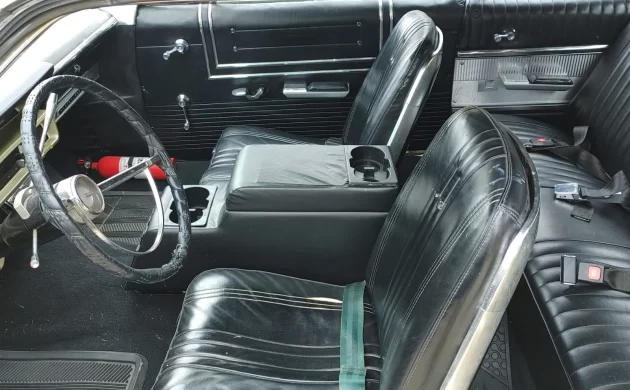 Apart from the exterior paint shade, the Galaxie’s interior is another area of profound change. Originally trimmed in Blue vinyl with a bench seat, a previous owner installed Black vinyl and bucket seats during the paint change. It remains presentable, although there is a small developing tear on the driver’s seat outer edge that an upholsterer could easily address. The front seatcovers look slightly “baggy,” which may be a sign of collapsing foam. However, the remaining upholstered surfaces and the carpet meet the standard expected for a driver-grade classic. Aftermarket additions include an underdash CD player and a center console/cup holder.