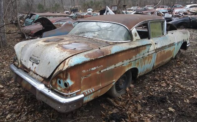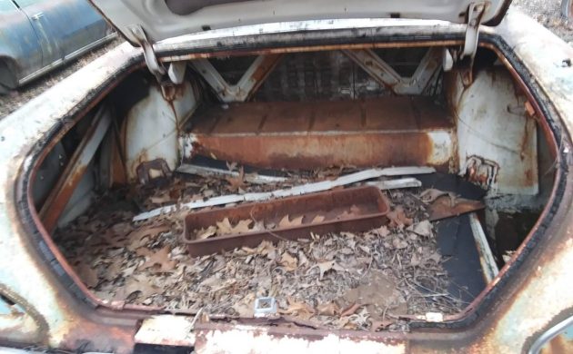The seller tells us, “WHAT YOU SEE IN THE PICTURES IS ALL THERE IS TO THIS CAR.” What I see is lookin’ shaky. The body, actually, appears to be fairly solid, but it’s the portions that you can’t see (the frame, etc) that are concerning. The lack of a windshield and rear side windows probably hasn’t helped the floor pans any. Other parts, like the trim and taillights, have gone missing, and the clutter in the trunk is obscuring the pan. The surface rust is obvious, but some, in the valance beneath the trunk lid and in the bottom of the passenger door, for example, may be more invasive.