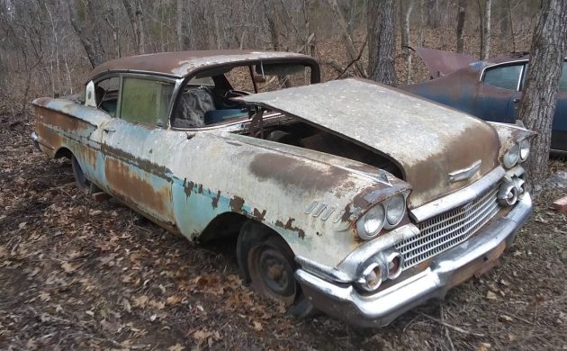 When I first spied this 1958 Chevrolet BelAir two-door sedan, I initially thought it looked like the victim of a mob hit with its door blown off and the hood all askew. Well, that’s not exactly what happened (I think); it’s just an old, forlorn, titleless Chevy that likely has little future possibilities. Or does it? Don’t know, let’s check it out and decide. Mitchell G. found the listing for this notable model; it’s located in Springfield, Missouri, and is available here on craigslist for $900.