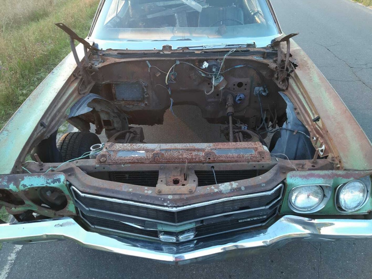 The news doesn’t get a lot better when you take a glance into the engine bay. The original 402ci V8 and 4-speed manual transmission are also gone, but at least the 12-bolt rear end and the 1¼” front sway bar are still there. The Chevelle also comes with front disc brakes, but the wheels that are currently fitted to the car don’t go with it. There will be a set of standard wheels fitted to the car for the next owner.
