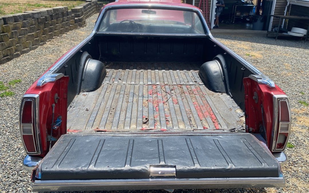 Externally, this Ranchero is fair at best, it has some dents and mismatched paint, rust-through in the bed, and missing grille trim. Apparently, this Ford was originally blue and then later repainted red and that probably explains the color hue differences. It does still maintain a stock appearance and is Ford recognizable by its pie-pan hubcaps/trim rings combo – an inexpensive way for Ford to add a little affordable styling flavor.