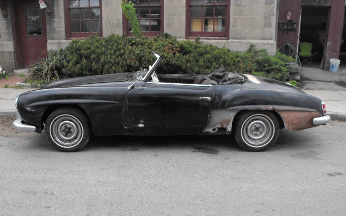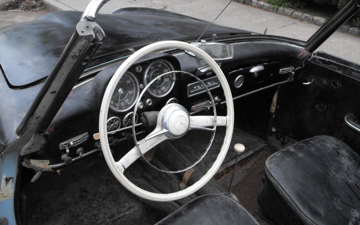The seller notes the windshield is missing but the interior otherwise appears quite sound. The fittings all seem to be original, with no signs of switchgear missing and the original steering wheel and shift knob still in place. Windshield glass won’t be cheap but it isn’t impossible to find, either. The seller notes the front grill is also missing but that’s likely the same story as the windshield when it comes time to source a new one. I’m guessing the exterior is not the original color, as I doubt Mercedes sold a black-on-black 190SL in 1960.