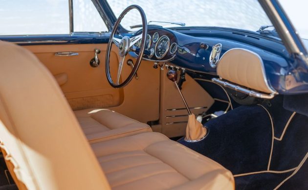 Of course, the provenance of this car is well-documented, so we know that in the care of the consignor, it received a complete, concours-quality re-trim in buttery, pleated, woven leather. Here’s a view of the inside door pocket. Other than the outstanding quality of the materials and craftsmanship paid for by its current caretaker, the buyer will be treated to the Italian flair for supplying a well-appointed cabin, with several gauges, a color-matched painted dash with leather padding backing a grab bar, piped trim on the carpets, and that long, slender gearshift lever.