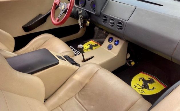 The seller explains that this replica features an extended Fiero chassis, which allows the bodywork to align more closely with its exotic inspiration. The roofline was slanted back and fitted with a Chrysler Sebring windshield, an upgrade that helps achieve a silhouette nearly identical to the original design it mimics. Wide rockers, custom suspension with coilovers, and a wide-track stance give it the proper proportions, while a set of period-correct OZ Monte Carlo wheels (18×8 front, 18×10 rear) complete the look.