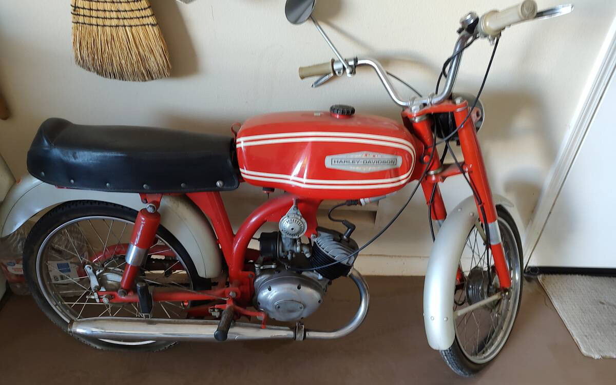 This is the first motorcycle I got when I was 13. Back in the early 70s, I didn’t know who made it or cared, kick starter was busted off,but didn’t need it, light’s were busted off, didn’t need em, three speed clutch and shifted with the same lever, I loved it! Realized there was a decal under the rattle can paint job when I was patching the back tire, made in Italy by ammorecci for Harley Davidson of USA. That’s All I needed to get started for life!