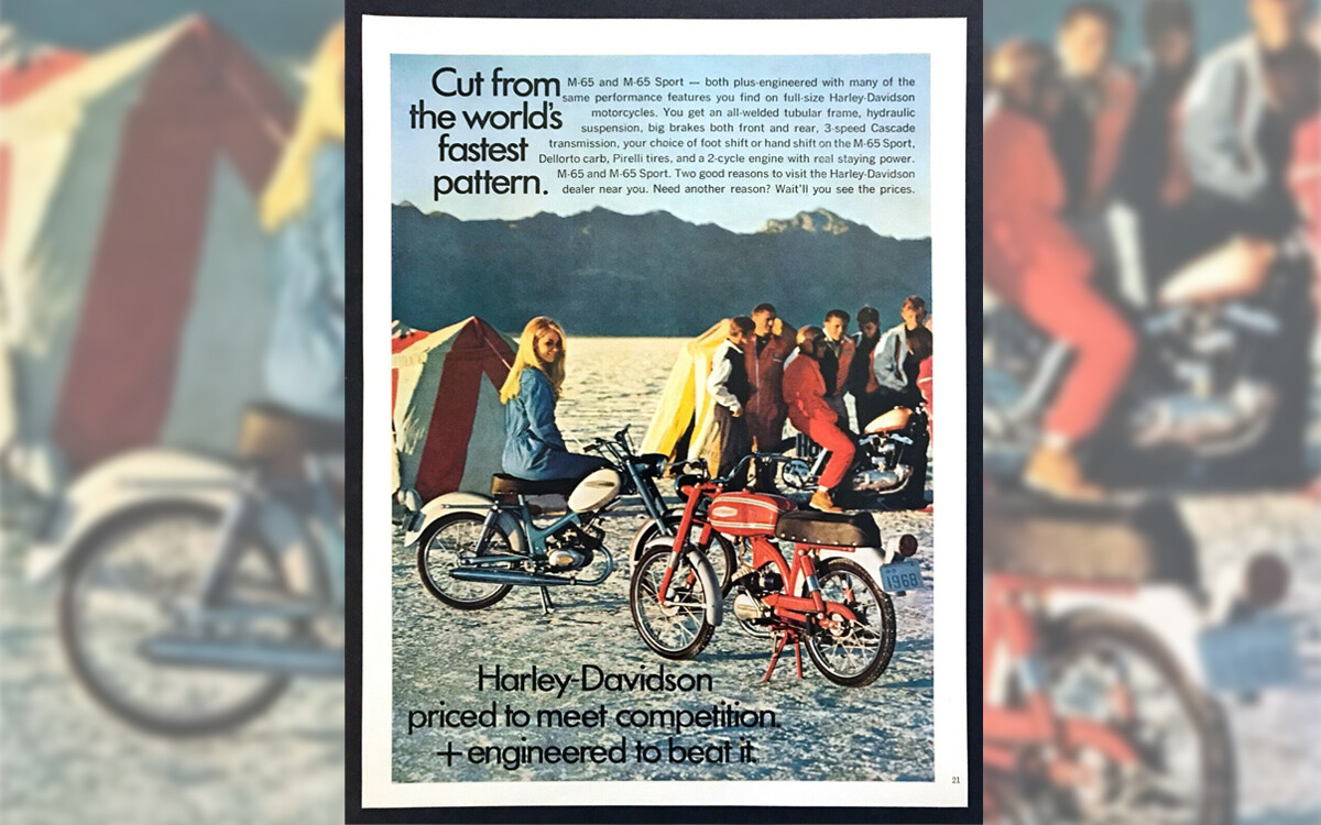 In 1960, Harley-Davidson bought a 50% stake in Italian company Aermacchi’s motorcycle division in order to try to keep up with the influx of small import bikes that were flooding the U.S. market at that time. It was an interesting mix, to say the least. They offered several small motorcycles, including the step-through M-50 which was similar to the step-through M-65, but the one that you wanted if you were a 65-cc buyer was the leg-over M-65 Sport or M-65S. The company bought the remaining portion of Aermacchi in 1974 and then sold it in 1978. Small, two-stroke rebadged Italian Harleys weren’t meant to be.