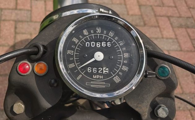 Whoa, I’m not overly-superstitious, but I’d probably roll this one around until it read 667 on the odometer, ha. Maybe that’s why the kick-start isn’t currently working. This example could use some cosmetic help, as you can see, mainly on the gas tank. I love the classic 1970s Harley graphic running across the 2.4-gallon gas tank; I’d want to redo that. U.S. regulations required turn signals on motorcycles by 1973, so those are seen here.