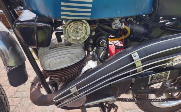 The engine, protected by a steel plate for off-road use, is Aermacchi’s 124-cc, oil-injected two-stroke single with 15 horsepower, and it’s sent through a five-speed manual to a dual-sprocket rear wheel. I had a similar system on a 1967 Honda CT90 that I had recently, and it wasn’t ideal to change between the two sprockets. This one appears to have had the engine cases painted black, which isn’t the end of the world with the black, upswept off-road-friendly exhaust being black. It’s said to run well if you push-start it, but the kicker isn’t working. Gearbox and hard-to-shift issues are fairly common, so hopefully it isn’t related to that. Have any of you heard of this model?