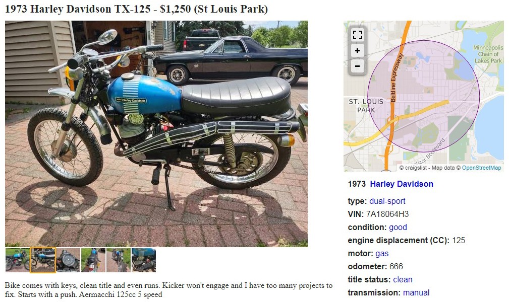 Harley-Davidson touted the new-for-’73 TX-125 as an “on-road, off-road, 5-speed, oil-injected good time machine.” We’ve seen a few Harley+Aermacchi motorcycles here on Barn Finds over the years, and they’re always interesting to dig into. This 1973 Harley-Davidson TX-125 can be found posted here on craigslist in St. Louis Park, Minnesota (wait, what?!), and the seller is asking $1,250. Here is the original listing.