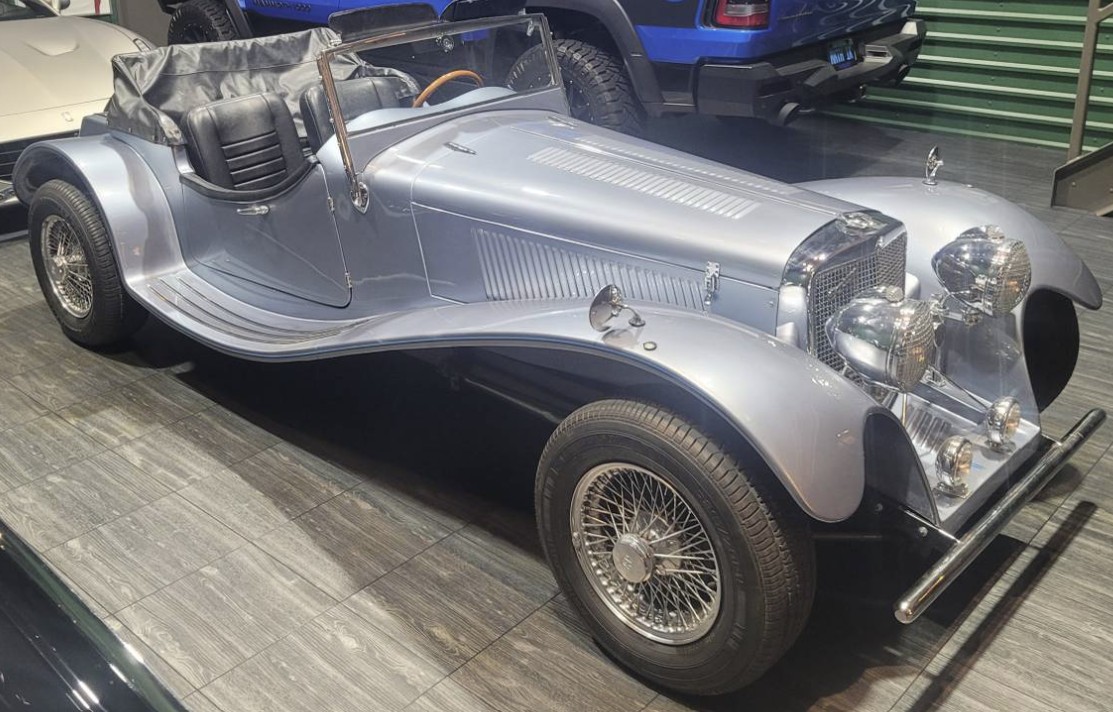 How faithfully these recreations hew to the original depends on the maker’s philosophy: a nut-and-bolt equivalent using a Jaguar engine, Jaeger gauges, Connolly leather, Wilton wool, burled wood, a steel chassis to factory measurements, and timber-framed aluminum panels – Finch’s method – will cost the prospective owner plenty. A fiberglass body approximating the original, augmented by an American drivetrain, can be had today for mid-teens or less. Turin-based Intermeccanica built fifty of its “Squire” SS100 replicas for a fellow named Frank Felbin, who owned Auto Sport Importers, Inc., of Philadelphia. Intermeccanica followed the fiberglass body/Ford drivetrain recipe. This example runs a Ford 289 cu. in. V8 and a C4 automatic. The car is said to be fully restored and updated; the odometer reads 26,500 miles, said to be original.