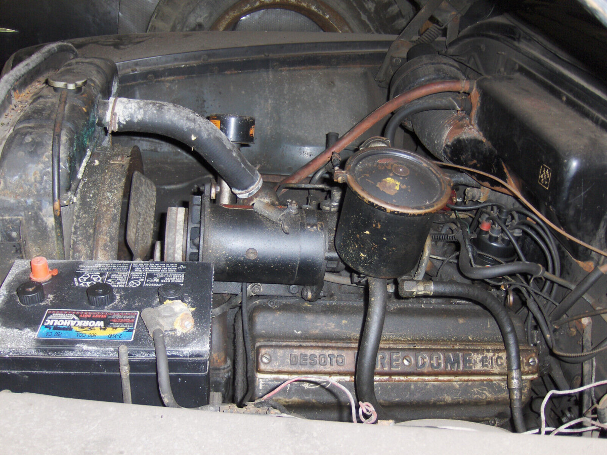 #1288, the guy down the block from my parents, was George, and older than us, and a terrible influence on a young mind. In the late 60s, he bought a ’54 Chrysler in pristine condition, with a blown 6 cylinder, automatic. Fact is, he had to promise the sellers he would fix it. He agreed, and did he EVER fix it. He found a ’53 DeSoto, just like this, $50 bucks, I think, and put this motor in the Chrysler, and proceeded to kill the Chrysler. It did wicked burnouts, for a while until the trans puked.