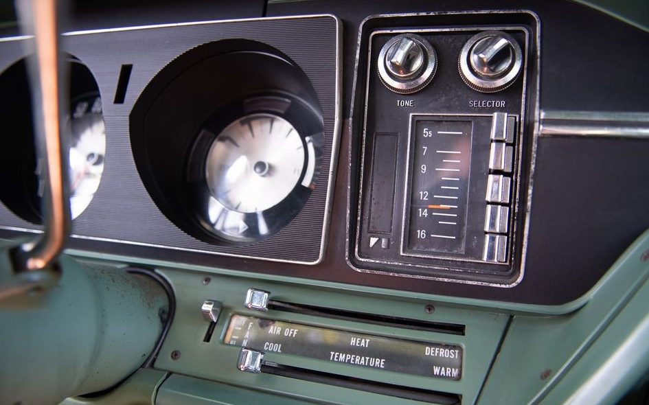 The very green interior looks great. The simplicity of the instrument panel is appreciated. While exposed screwheads wouldn’t cut it today, they sure made servicing instrument panel components easy. The original, vertically stacked radio, complete with an AMC logo, is just perfect!
