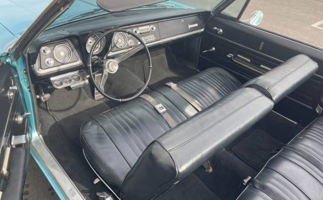 First up, the listing claims this car to be both a ’68 and a ’66 model; it’s a ’66. Now, with that out of the way, Oldsmobile’s 1966 lineup placed the Ninety-Eight at the top of the totem pole, followed by the Starfire performance model, the Delta 88, Dynamic 88, and then the Jetstar 88, at the bottom, bringing up the markers. Other Oldsmobile models included the brand new, front-wheel drive Toronado, and of course, the mid-sized, A-body Cutlass/F85/442. Dynamic 88s were available in four body styles: four-door sedans and hardtops, as well as two-door hardtops and convertibles. Convertibles were also available on both the Ninety-Eight and Delta 88 models. The total Dynamic 88 convertible count only reached 5,500 units in ’66, so this one’s not rare but not common either. The seller considers this car’s condition to be excellent, and it does show well. The blue finish, which I believe is Lucerne Mist Poly, looks like a repaint to my eyes. It’s in fine shape, mind you, it just doesn’t sit the way the original lacquer would have. Additionally, it looks like there’s a missing piece of stainless trim that should extend along the lower belt line on both sides. A victim of crash damage…or what? It’s not possible to tell without a closer, in-person inspection. The listing claims that the folding top is “Fully functional and in excellent shape.”